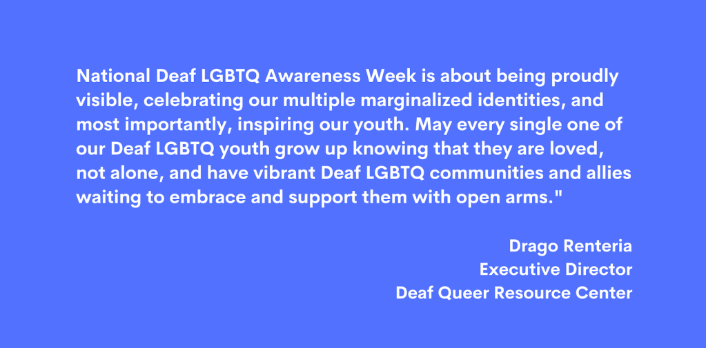 If you’re on social media, be sure to use and follow the hashtag #DeafLGBTQWeek so you can find other people’s posts and they can find yours during this fun and inspiring week.